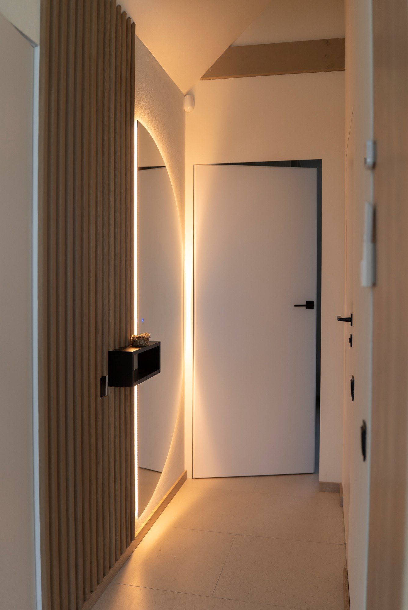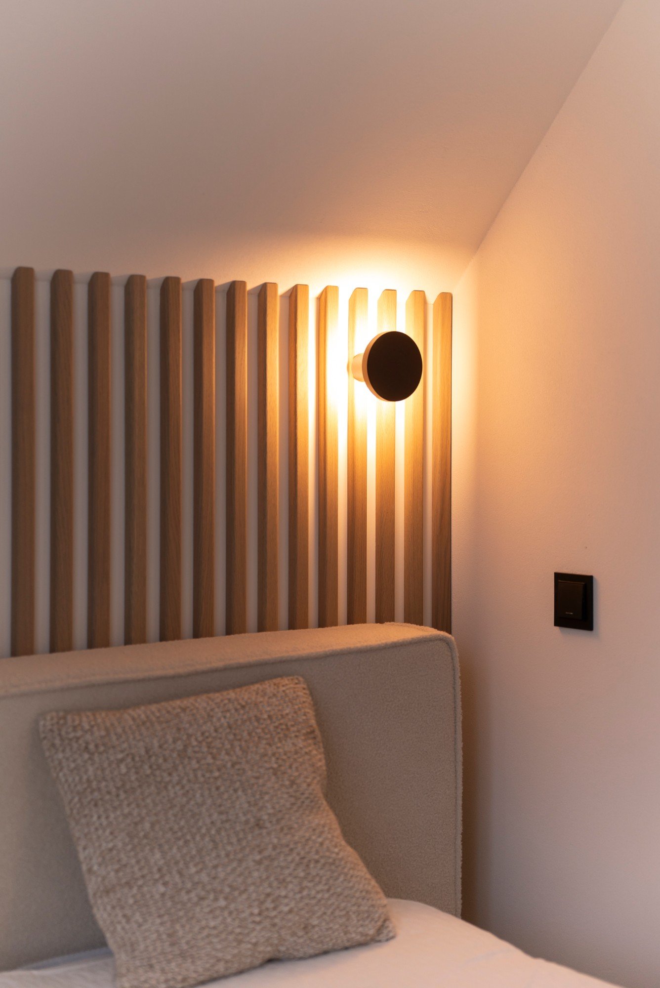 Спалнята е проектирана като уединено кътче за почивка, в което основна роля играят естествените материали и визуалното спокойствие. Мебелите от светло дърво създават хармонична, естетически изчистена композиция, докато стената зад леглото, съставена от вертикални дървени ламели, добавя деликатен акцент в стил „japandi“.