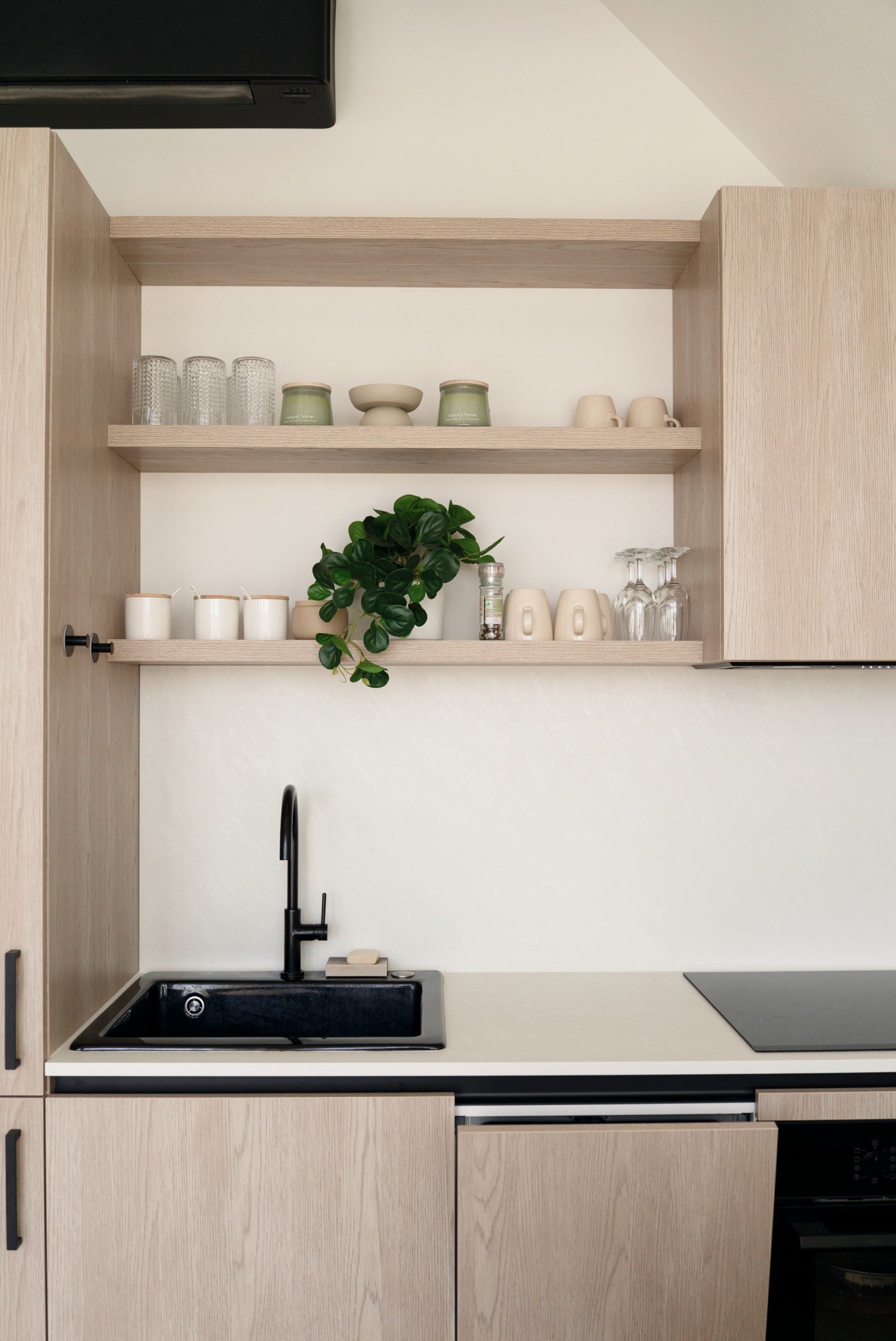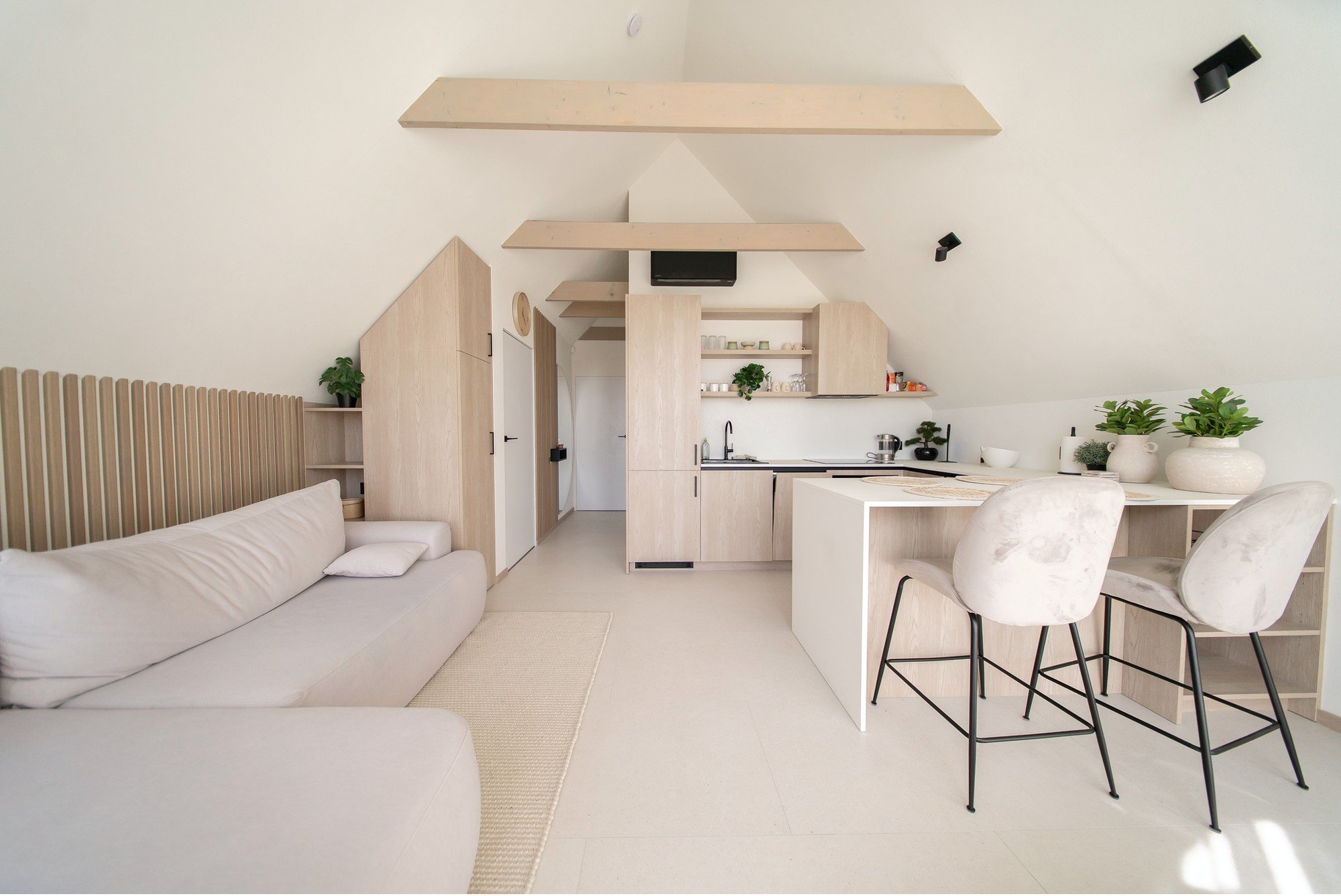 Мебелите в нежни тонове и заоблени форми смекчават изразителните архитектурни линии и приканват към почивка. Минималистичната кухня с декор от светъл дъб и бял плот излъчва чистота и спокойствие, докато черните детайли придават на пространството дискретен модерен акцент.
