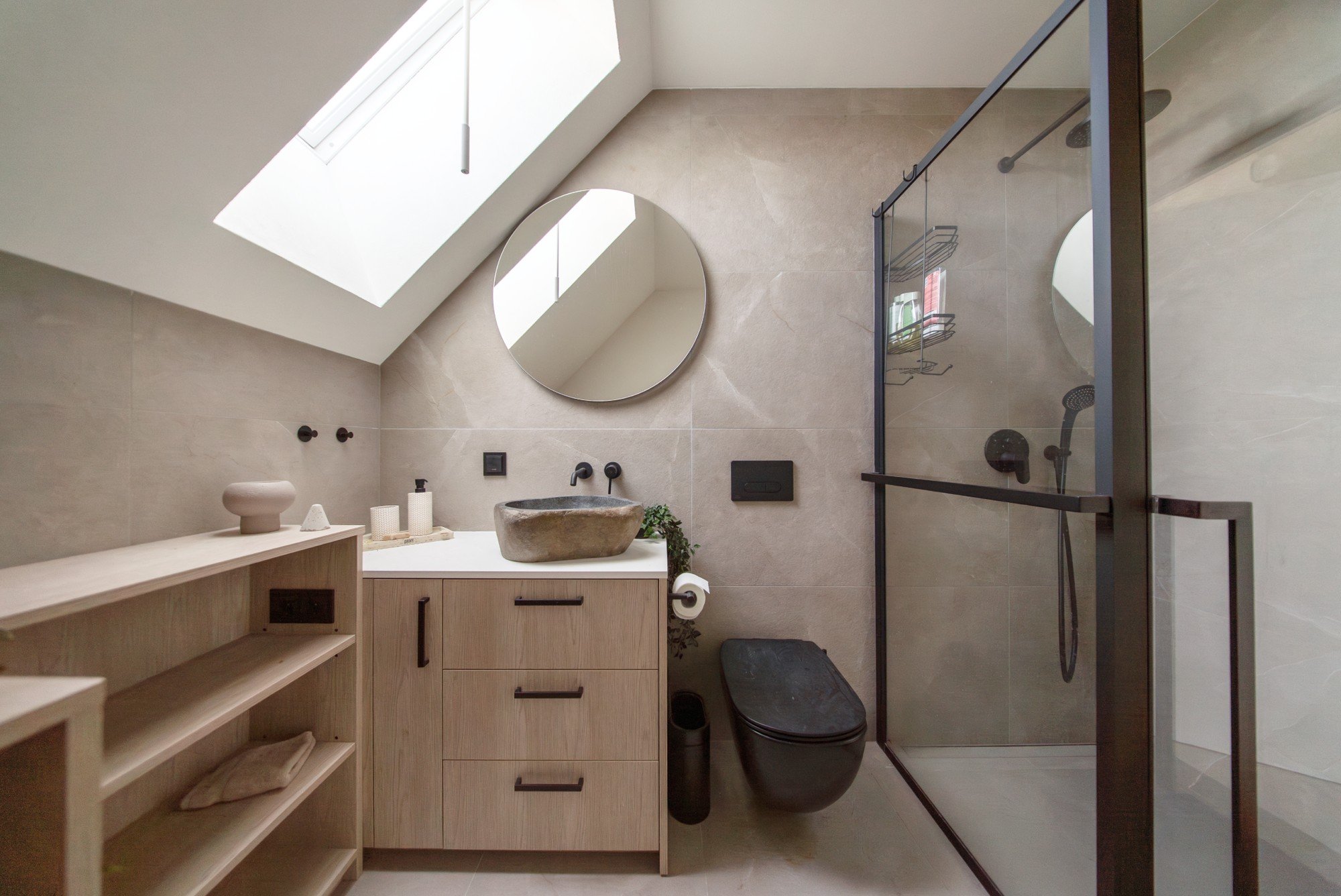 Умивалникът от естествен камък, монтиран върху плот, се превръща в изразителен дизайнерски елемент и подчертава връзката с природата. Покривният прозорец осигурява достатъчно дневна светлина в помещението, визуално го разширява и създава светла, хармонична атмосфера.