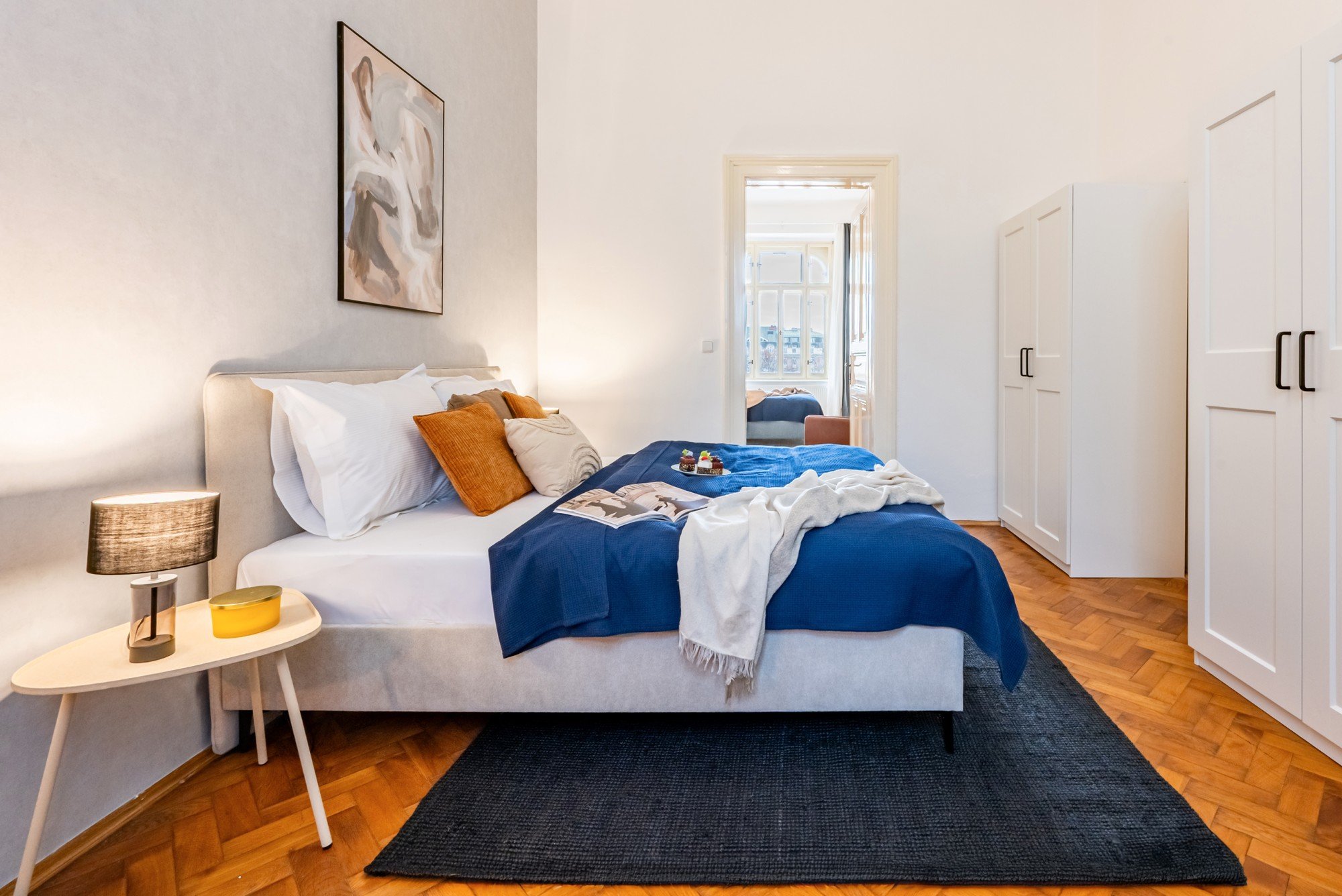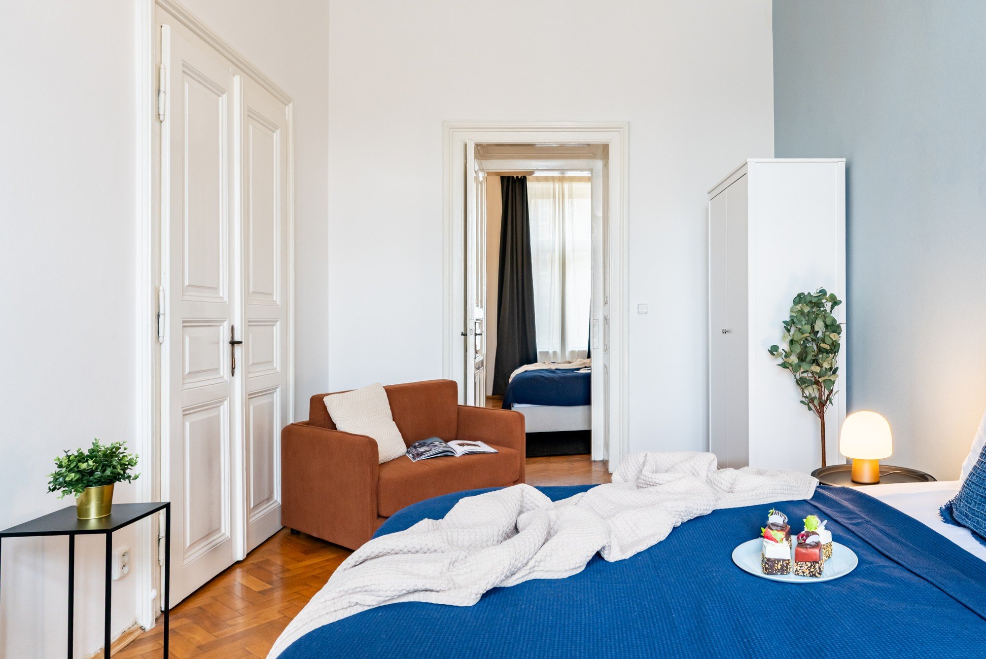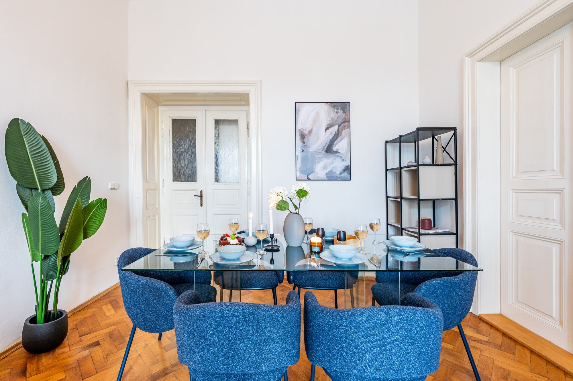 Просторният апартамент в историческа сграда съчетава щедри пропорции с добре обмислени детайли. Високите тавани, оригиналните паркети и контрастът между тъмното дърво и нежните нюанси на синьото създават вечен интериор, който е спокоен, елегантен и естествено уютен. Разположението, проектирано за ежедневието и общите моменти, доказва, че комфортът и характерът могат да вървят ръка за ръка.