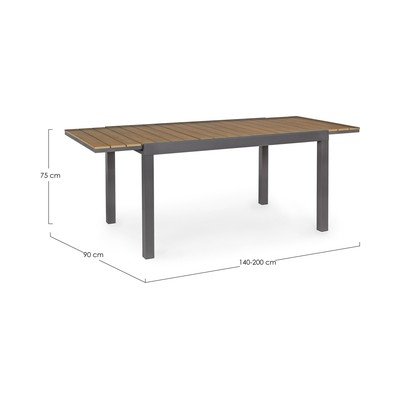 Алуминиевата градинска маса за хранене Elias на Bizzotto с масивна алуминиева конструкция в антрацит е идеалният избор за сядане на открито. Плотът с имитация на дърво придава на масата Elias естествен вид. Практичната сгъваема конструкция ви позволява да увеличите ширината ѝ до 200 см, което ви осигурява достатъчно място за по-голяма компания с лекота.