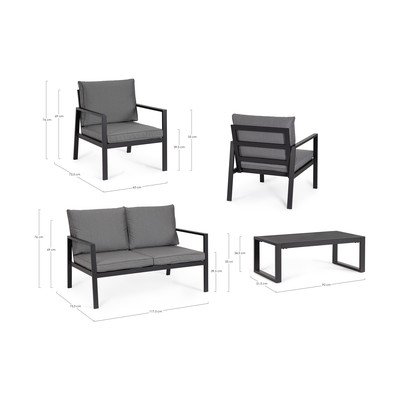 Диванът е с размери 117,5 x 73,5 x 76 cm, с височина на седалката 39,5 cm и височина на подлакътниците 55 cm. Всеки от фотьойлите е с размери 63 x 73,5 x 76 cm, височина на седалката 39,5 cm и височина на подлакътника 55 cm. Масата с решетъчен плот допълва комплекта с размери 92 x 51,5 x 34,5 cm. Целият комплект е изработен от алуминий, което гарантира неговата лекота и издръжливост.