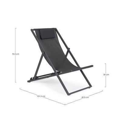 Дизайнът му позволява облегалката да се регулира в три различни позиции, така че винаги да намерите най-удобната. Шезлонгът е изработен от здрава метална рамка и издръжлива материя, която е лесна за поддръжка. За още по-голямо удобство той е оборудван с малка възглавничка за глава.