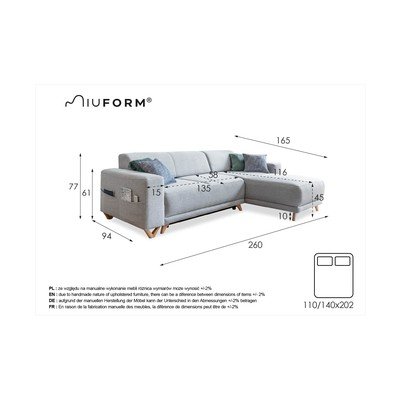 Сгъваем/с място за съхранениеДесен ъгъл/ляв ъгъл/променливАнтрацитенТриместенШирина 260 cmДълбочина 165 cmДълбочина на седалката 58 cm