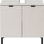 Шкафът е оборудван с две вратички и регулируем рафт с товароносимост до 10 кг. Горният рафт е с изрез за сифон и може да поеме до 3 кг, а долният рафт - до 10 кг. Шкафът стои на четири черни метални крака и има черни метални дръжки.