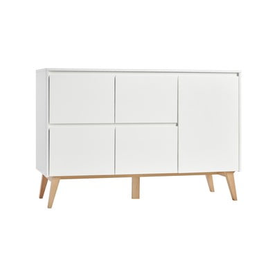Обзаведете стаята на малчуганите в скандинавски стил с Pinio и тяхната серия Swing. Този скрин е изработен от ПДЧ в бял цвят. Цялата конструкция е стабилна благодарение на масивните букови крака. Тази интелигентна цветова комбинация прави скрина лесен за съчетаване с останалата част от интериора. В допълнение към мястото за съхранение той предлага и място за маса за преповиване.