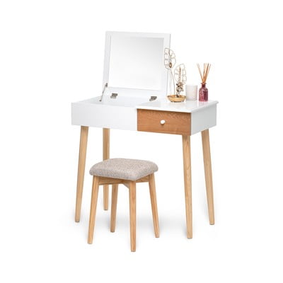 Лесно се сглобява, масата изглежда добре, само огледалото е ниско и трябва да се навеждам, за да го видя добре.