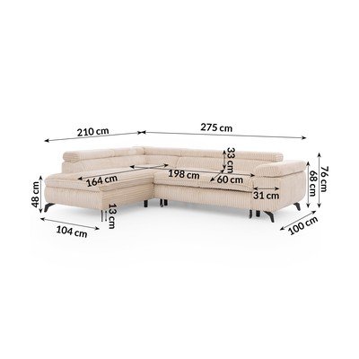 От рипсено кадифеПозициониране/сгъваем/с място за съхранениеЛяв ъгъл/L формаБежовПодходящ за домашни любимци/устойчив на петнаЧетириместенШирина 275 cm
