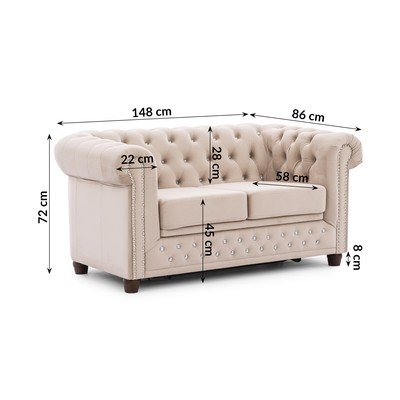 Кадифен, сгъваем, честърфийлд, бежов, водоустойчив/устойчив на петна, двуместен, ширина 148 cm