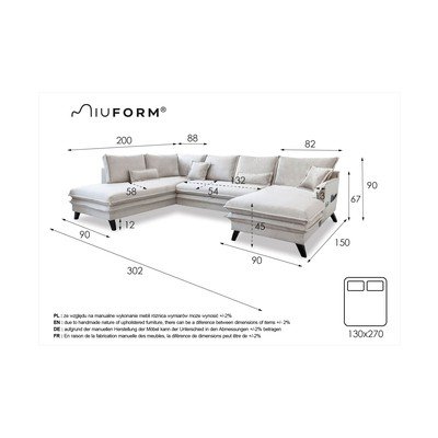 ШениловСгъваем/с място за съхранениеЛяв ъгъл/U формаСветлосивДругиШирина 302 cmДълбочина 200 cmДълбочина на седалката 58 cm