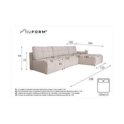 Сгъваем/с място за съхранениеДесен ъгълБежовТриместенШирина 338 cmДълбочина 184 cmДълбочина на седалката 56 cm