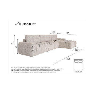 Сгъваем/с място за съхранениеДесен ъгълБежовДругиШирина 364 cmДълбочина 184 cmДълбочина на седалката 56 cm