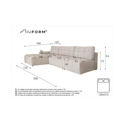 Сгъваем/с място за съхранениеЛяв ъгълБежовТриместенШирина 338 cmДълбочина 184 cmДълбочина на седалката 56 cm