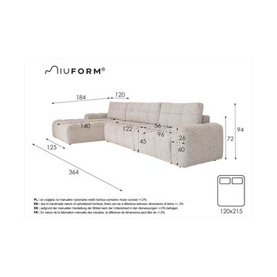 Сгъваем/с място за съхранениеЛяв ъгълБежовДругиШирина 364 cmДълбочина 184 cmДълбочина на седалката 56 cm