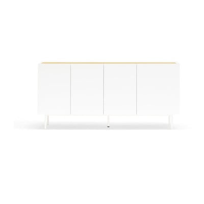 Белият скрин от колекцията Arista се отличава с изчистените си линии. Тъй като всички ръбове са скосени, мебелите изглеждат фини, сякаш стените им нямат дебелина. Лакираните вратички се допълват от плот от дъбов фурнир.