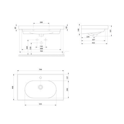 Керамична, бяла, ширина 80 cm, дълбочина 45 cm, височина 18 cm