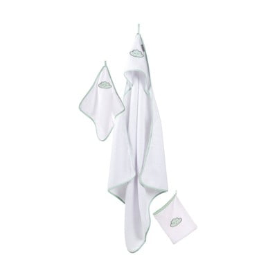 Комплектът кърпи Happy Cloud от Roba е идеален за грижа за бебето. Комплектът включва хавлиена кърпа с качулка (80 x 80 см), малка хавлиена кърпа (30 x 30 см) и кърпа за пране (16 x 20 см).