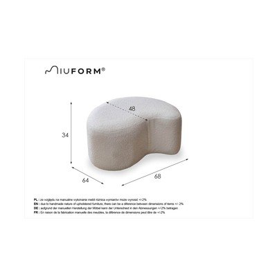 Pouf Miuf е чудесно отражение на марката Miuform. Дизайнът му се основава на логото на самата марка. Благодарение на приятната си повърхност и неутралния си цвят можете лесно да го съчетаете с всеки интериор. Можете да го използвате като табуретка за крака или малка масичка.