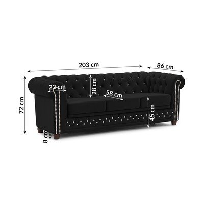 Кадифен, сгъваем, честърфийлд, черен, водоустойчив/устойчив на петна, двуместен, ширина 203 cm