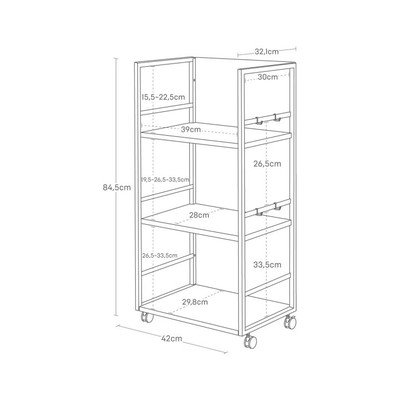 Два от рафтовете са с регулируема височина, което предлага гъвкавост при подреждането. За по-лесно пренасяне има дръжка на задната стена, а рафтът се предлага с четири удобни куки.