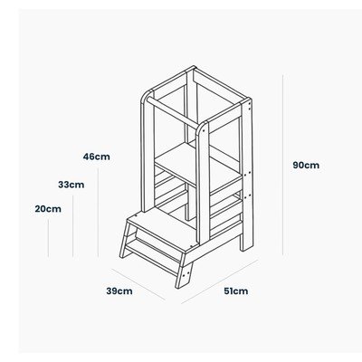 Конструкцията е стабилна и е изработена от дърво, което гарантира безопасността. Височината на платформата може лесно да се регулира без инструменти, в три варианта: 20 см, 33 см и 46 см от пода, което позволява да се адаптира към размера на детето и насърчава неговата независимост. В допълнение, едната страна на кулата е оборудвана с дъска, която предлага допълнително пространство за творчески дейности.