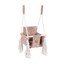 Седалката е изработена от мек велурен материал с подплатена облегалка, а скритата дървена дъска предотвратява провисването и спомага за правилната стойка. Дървените елементи придават на люлката допълнителна издръжливост. За окачване са използвани 9-милиметрови памучни въжета, които са здрави и нежни към детските ръчички.