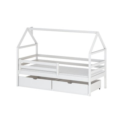 Детско легло Aron80x160 cm, къща, с място за съхранение, с включена подматрачна рамка, от масивен бор, oбработка на повърхността: лак, бяло