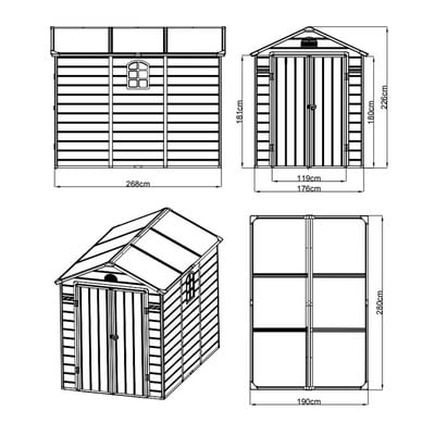 Благодарение на висококачествения пластмасов материал тази градинска къща от Rojaplast се характеризира с лекота и издръжливост, дори на UV лъчи и атмосферни условия. Необходимата здравина на цялата конструкция се осигурява от метални арматури, външни пластмасови панели (12 мм) и пластмасови стълбове (1,5 мм).