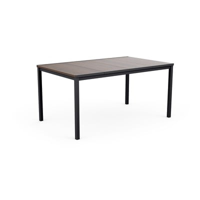 Масата съчетава издръжлива метална конструкция с пластмасов плот с орехово покритие, който вярно имитира дърво. Тази комбинация гарантира не само атрактивен външен вид, но и висока устойчивост на атмосферни влияния.