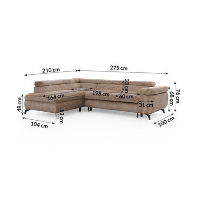 От рипсено кадифеПозициониране/сгъваем/с място за съхранениеЛяв ъгъл/L формаКафявПодходящ за домашни любимци/устойчив на петнаЧетириместенШирина 275 cm