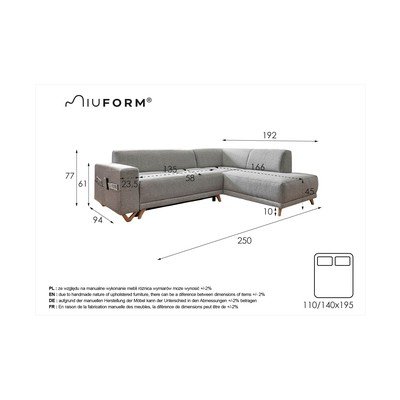 Сгъваем/с място за съхранениеДесен ъгъл/L формаКафявЧетириместенШирина 250 cmДълбочина 192 cmДълбочина на седалката 58 cm