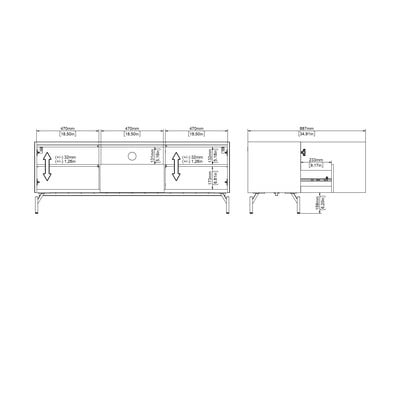 Тази масичка с широчина 147 см в дъбов цвят предлага много място за съхранение благодарение на два шкафа с регулируеми рафтове и едно чекмедже. Отворената централна част осигурява лесен достъп до оборудването, а системата за управление на кабелите поддържа всичко организирано. С метални крака и модерен дизайн тя се вписва в различни интериори.