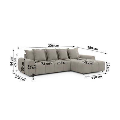 Десен ъгъл, кафяво-сив, водоустойчив/устойчив на петна, четириместен, ширина 306 cm