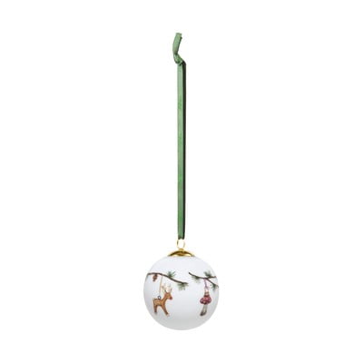 Порцелановата колба е украсена с типичния за тази колекция мотив - борова клонка с борови шишарки, на която са окачени коледни украшения. Благодарение на зелената копринена панделка можете лесно да я закачите на дърво или на клонче във ваза.