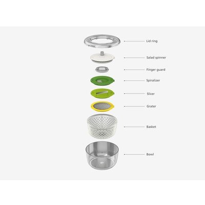 В основата на този комплект Multi-Prep е центрофугата за салата, която се използва за старателно измиване и след това за подсушаване на измитата салата. След това централният диск в капака на съда може да се замени с диск, използван за спираловидно нарязване, нарязване на филийки или настъргване на зеленчуци. След като измиете и подсушите всички приставки, просто ги поставете във вътрешната кошница на ротационната центрофуга.