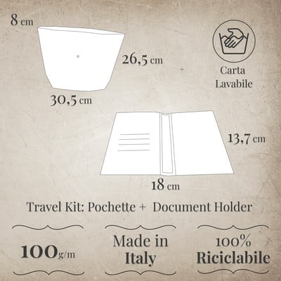 Кориците за книги с чанта от Kartos са изработени от миеща се хартия (100 g/m2). Размерите на кориците са 18 x 13,7 cm, а на чантата - 30,5 x 26,5 x 8 cm.