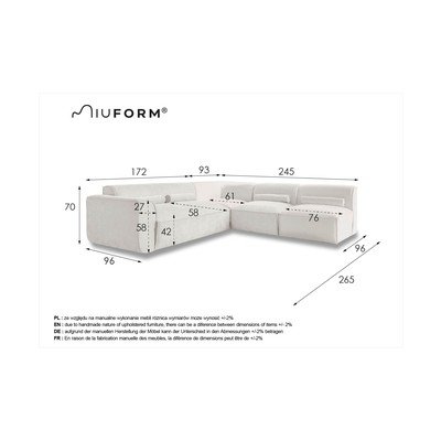 Десен ъгъл/L формаКремавДругиШирина 265 cmДълбочина 245 cmДълбочина на седалката 58 cm
