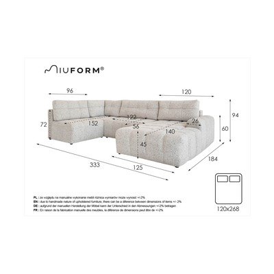 Сгъваем/с място за съхранениеЛяв ъгълКремавДругиШирина 333 cmДълбочина 187 cmДълбочина на седалката 56 cm