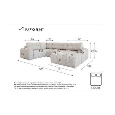 Сгъваем/с място за съхранениеЛяв ъгълКремавЧетириместенШирина 333 cmДълбочина 213 cmДълбочина на седалката 56 cm