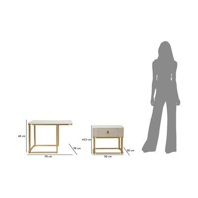 По-голямата масичка е с мраморен плот и е с размери 70 x 70 x 48 cm. По-малката масичка, с размери 50 x 50 x 43,5 cm, има практично чекмедже, което е идеално за съхранение на дребни предмети. Вътрешните размери на чекмеджето са 26 x 28 x 7 cm. И двете мебели стоят върху солидни метални конструкции.