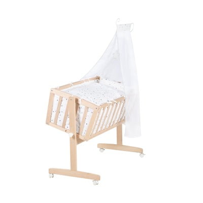 Текстилът на люлката е изработен от 100% памук без вредни вещества и предлага оптимален климат за сън. Комплектът спално бельо се състои от калъфка за възглавница (40 x 35 cm) и калъфка за завивка (80 x 80 cm). Бебешката ватирана завивка е изработена от дишащи и регулиращи температурата климатични влакна.