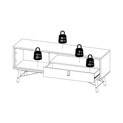 С размери 150x60x40 см тя предлага много място за съхранение благодарение на два заключващи се шкафа и един отворен рафт. Черните метални крака придават на масичката модерен индустриален привкус. Масата е оборудвана със система за управление на кабелите, която осигурява яснота и ред.
