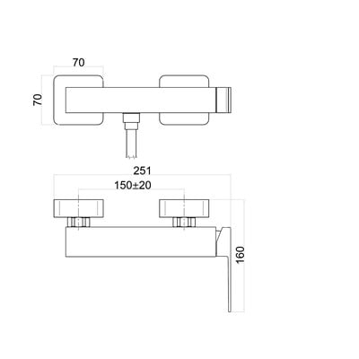 Този стенен смесител за душ с минималистичен дизайн от месинг и лостче е оборудван с 25-милиметров патрон. Тъй като се доставя без аксесоари, трябва да се закупят ръчен душ и маркуч за душ. Разстоянието между отворите за подаване на вода е 150 mm.