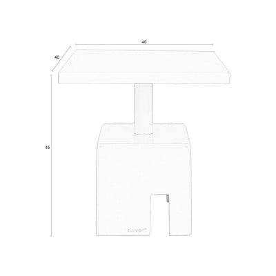 Тя е ръчно изработена в Индия от издръжливо желязо и алуминий, което прави всяка част уникална. Масичката се състои от квадратен плот и кубична основа с изрязана част.
