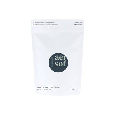 Прахът за пране Aer залага на устойчивост, екологичност и цялостност. Не само ще постигнете чисто и свежо пране, но и ще елиминирате пластмасата - той се предлага в опаковка от компостируема и разграждаща се хартия.