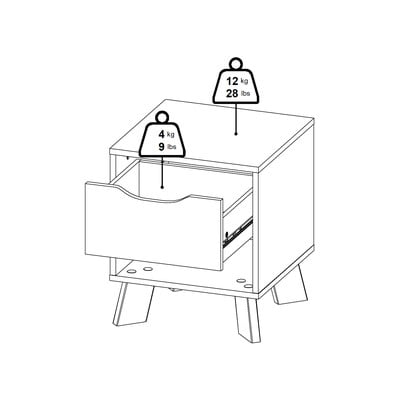 Практично чекмедже с изрязан отвор за лесно отваряне осигурява място за съхранение, а отвореният рафт под него предлага място за декоративни предмети или книги. Масата стои на четири наклонени крака, които ѝ придават стабилност и елегантен вид.