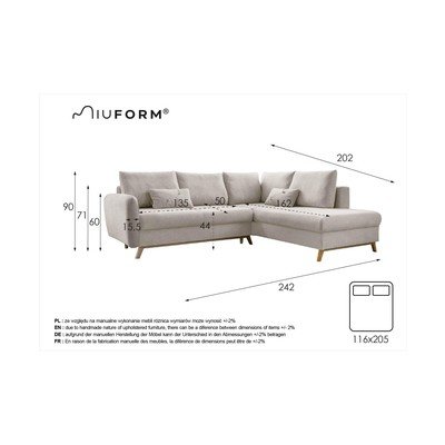 Диванът Lagom съчетава простота, функционалност и естетика. Благодарение на основната си конструкция и високите крака от букова дървесина той изглежда лек и внася нотка скандинавски стил в интериора. Диванът разполага и с режим на разтегателен диван и място за съхранение. Следователно може да се използва като легло за гости. Насладете се на комфорта с марката Miuform.