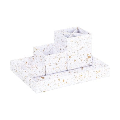 Изработен е от здрав рециклиран картон и е покрит с хартия, която произхожда от гори, управлявани с грижа за екологията и устойчивостта. Долната страна на органайзерите е гумирана, за да не повреди плота на бюрото ви.