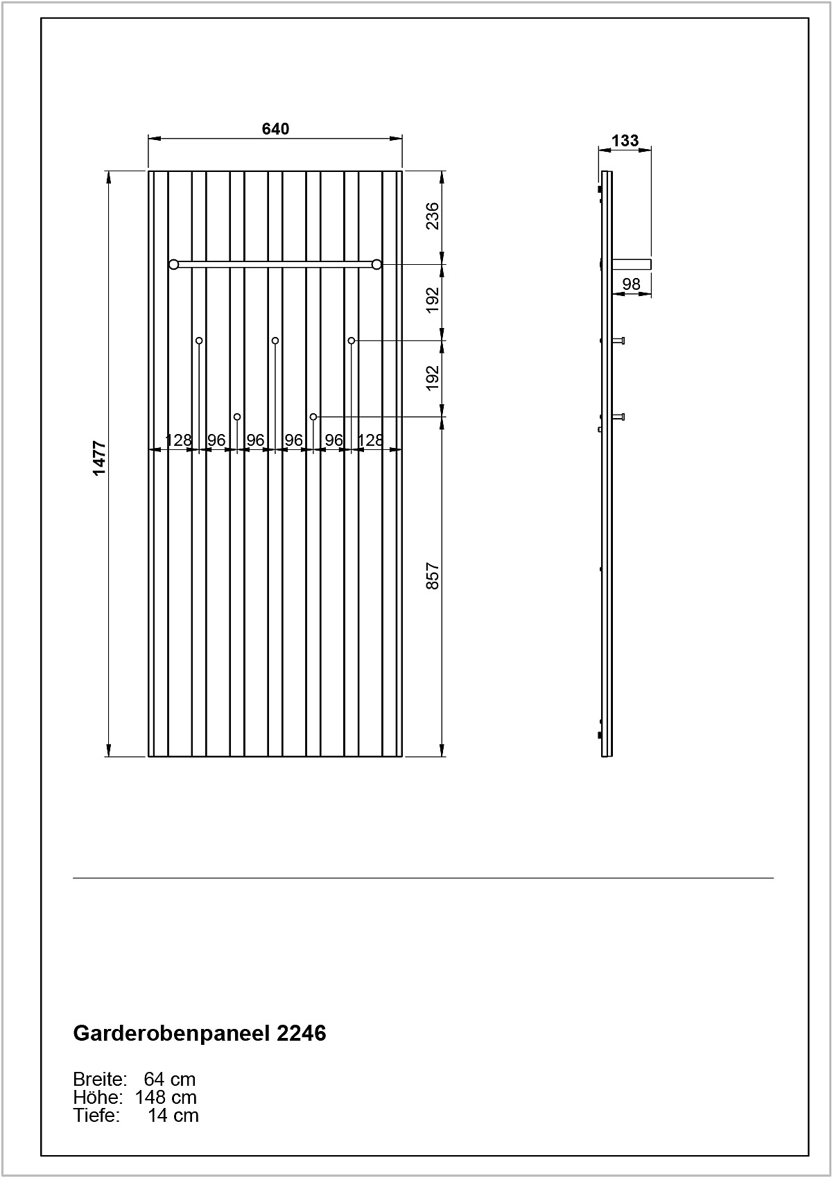 Панелът за окачване Renell в дъб с черни детайли е практично допълнение към коридора. Панелът е оборудван с метална шина за закачалки с товароносимост до 10 кг и пет метални куки с товароносимост 3 кг на кука.