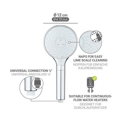 Благодарение на вградения регулатор WaterSaving дебитът може да се регулира до само 9 литра в минута, което представлява икономия от поне 35% в сравнение със стандартните душ глави. Тази душ-глава с диаметър 12 см не само подобрява външния вид на банята ви, но и спомага за опазването на околната среда, като пести вода и енергия.